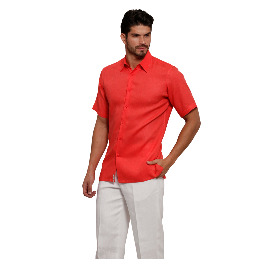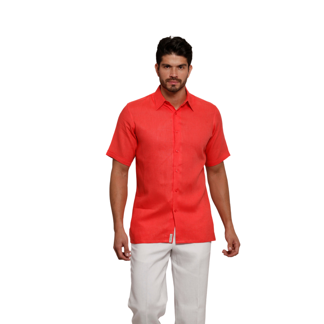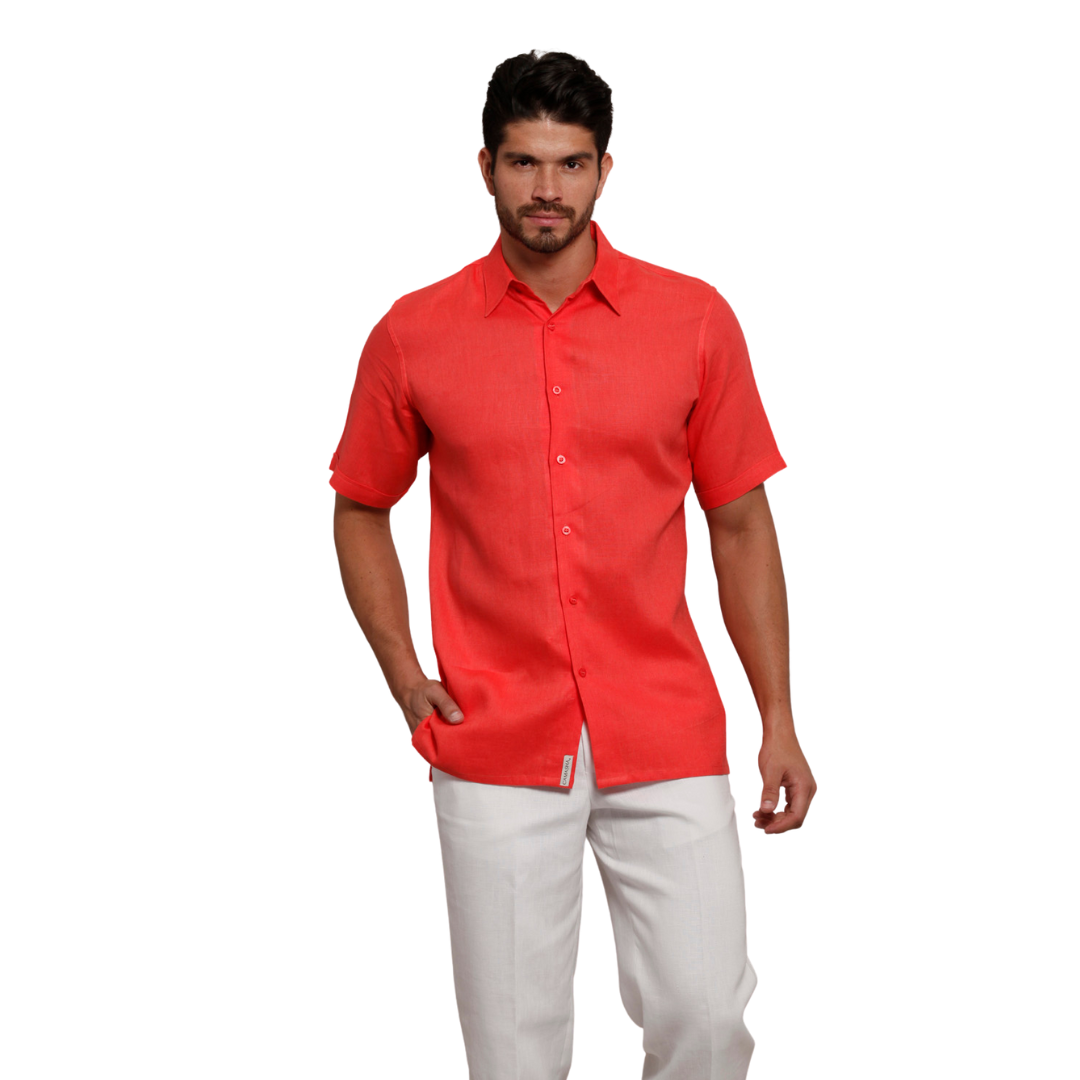 Perfecta para cualquier ocasión, esta camisa de manga corta de lino en un vibrante color coral combina a la perfección la comodidad y el estilo. Su tejido de lino transpirable te mantendrá fresco en los días más cálidos, mientras que su diseño clásico de botones la convierte en una prenda versátil.