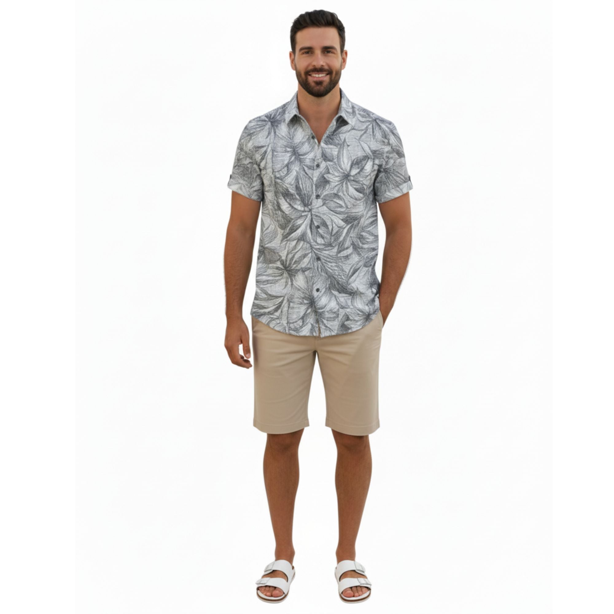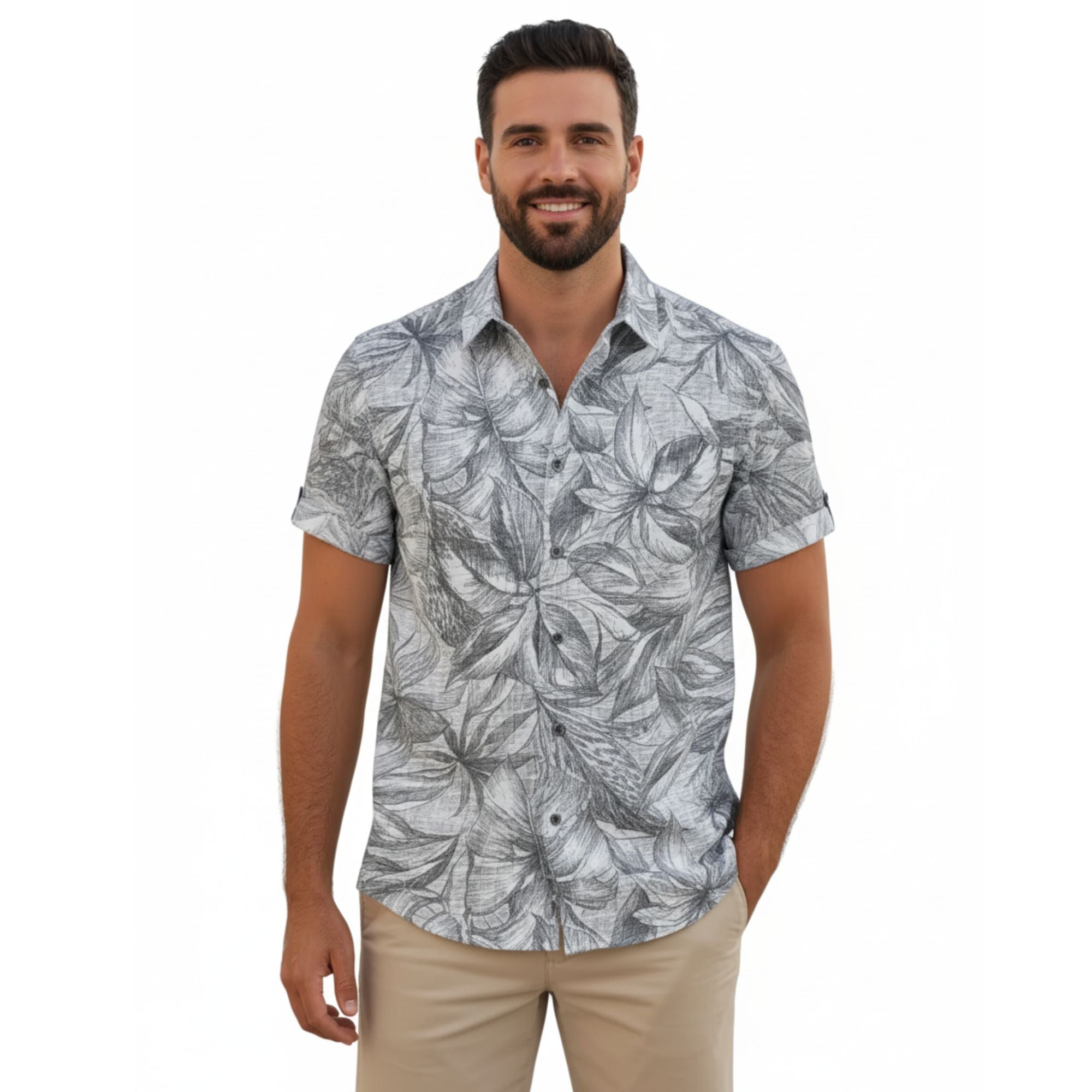Luce un estilo casual y elegante con la camisa de hombre ZEN LETICIA. Confeccionada en 100% algodón estampado, esta prenda combina la frescura de una guayabera de manga corta con un moderno diseño de hojas tropicales en tonos grises. Ideal para cualquier ocasión, ya sea un evento en la playa, una reunión casual o para el día a día. Su corte relajado y tejido ligero aseguran la máxima comodidad y un look distintivo. Eleva tu guardarropa con esta pieza versátil que captura la esencia del estilo hawaiano sin perder sofisticación.