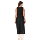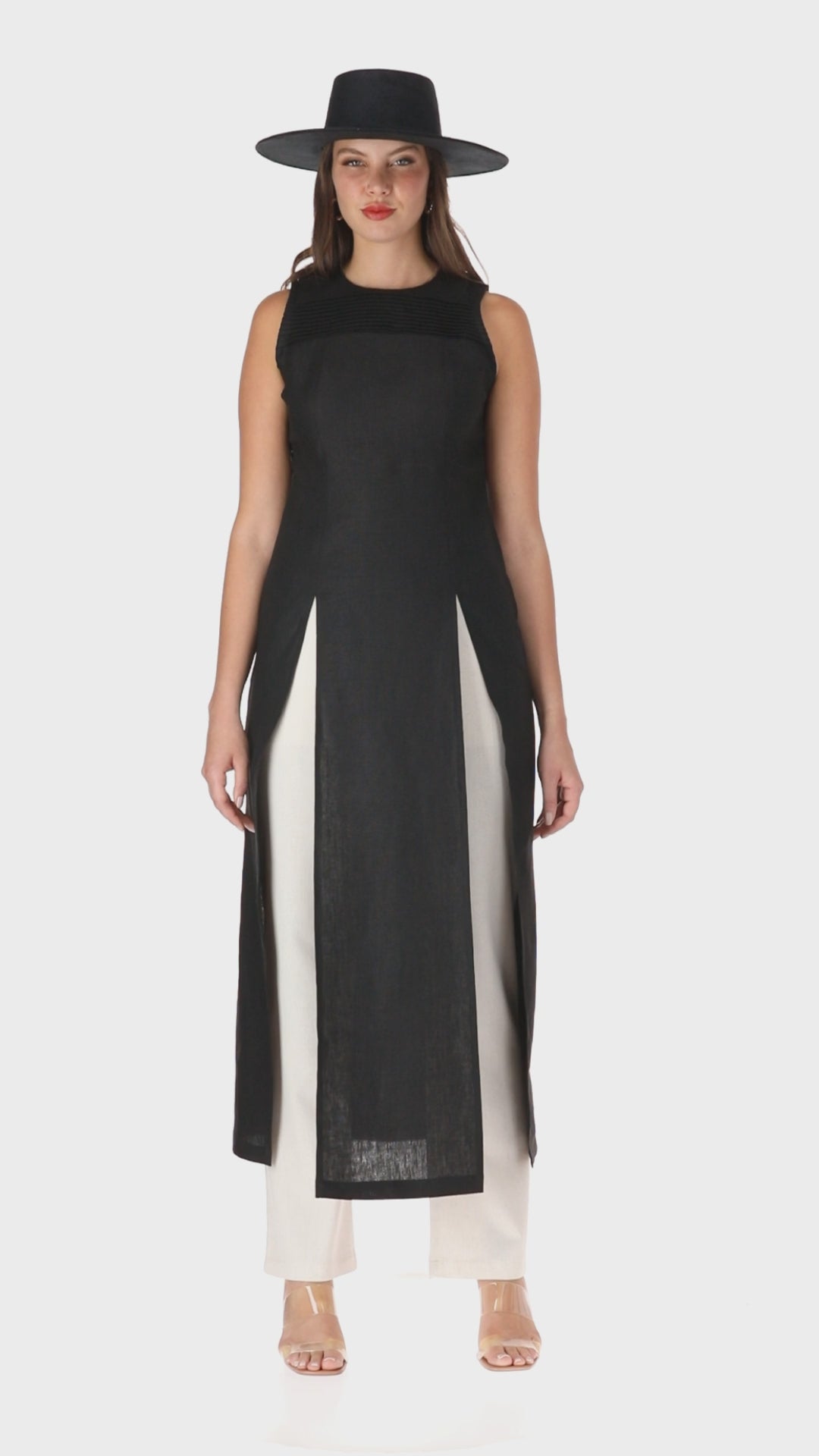 El diseño presenta un cuello redondo y aberturas laterales pronunciadas que no solo ofrecen un movimiento fluido, sino que también estilizan tu figura. Su corte recto y silueta alargada la hacen perfecta para combinar con pantalones ajustados o anchos, creando un look tanto casual como formal.