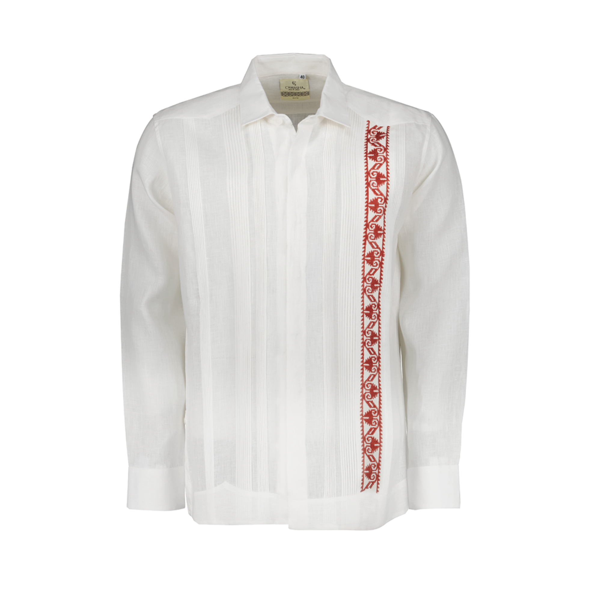 Disponible en tallas estándar o con opción de ajuste a medida, la Guayabera Haxú es una pieza de colección que representa el orgullo y la tradición mexicana con un diseño exclusivo de Camasha.