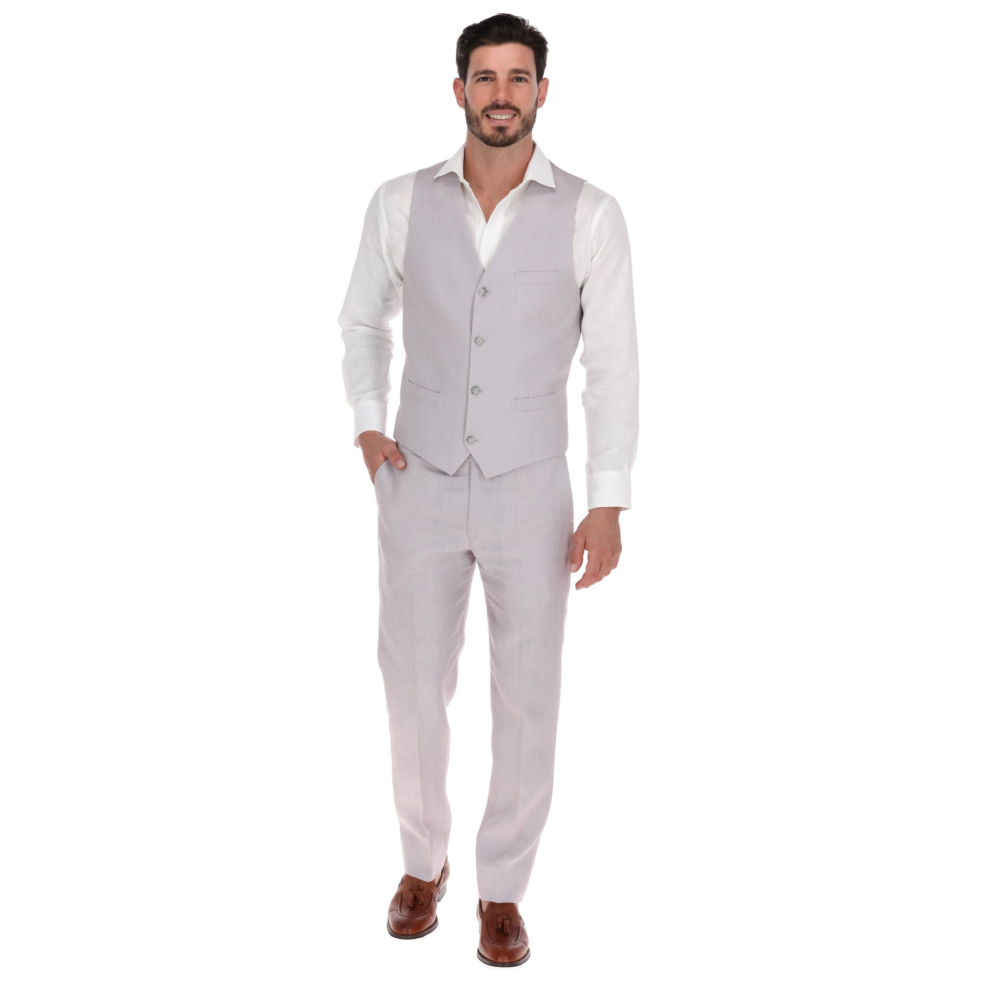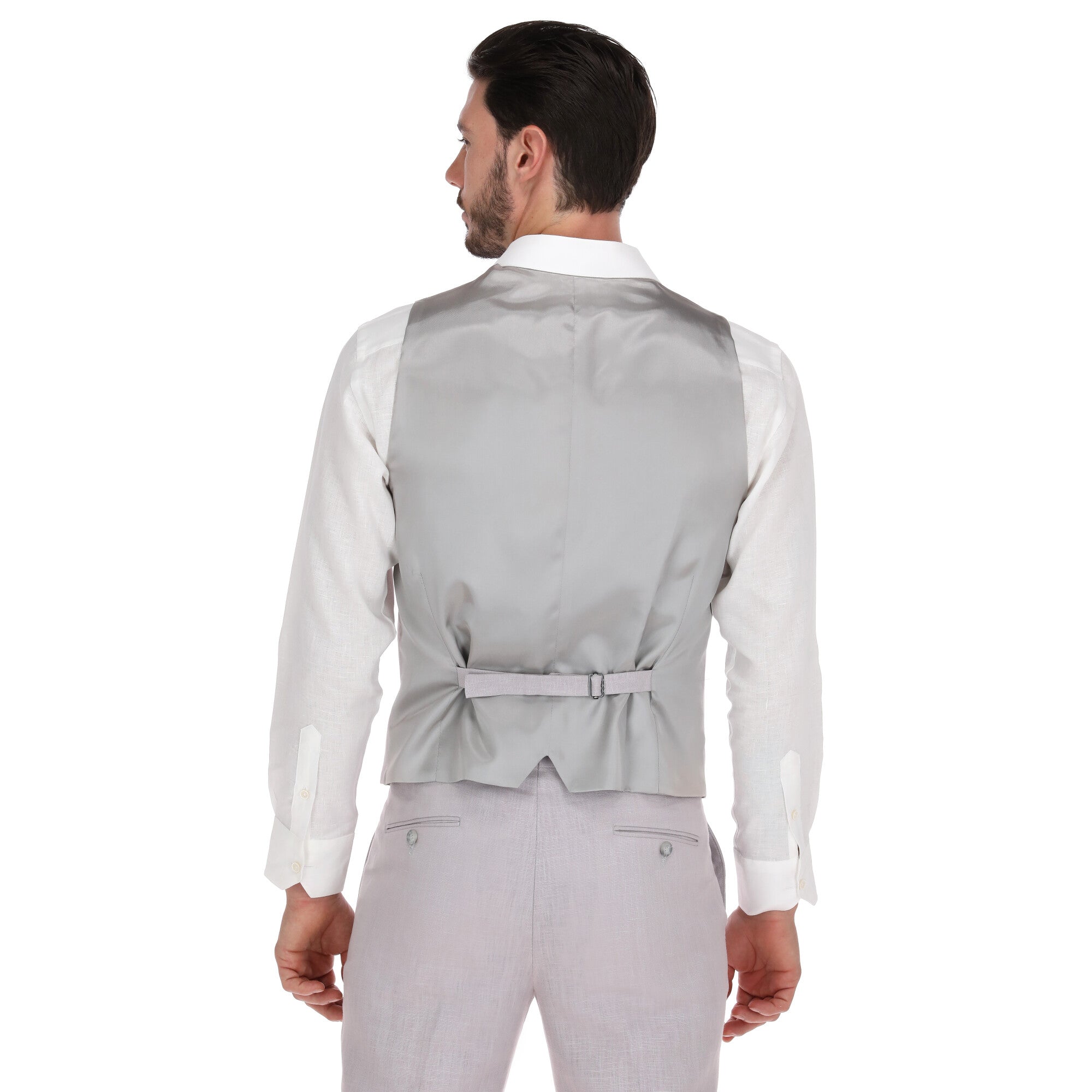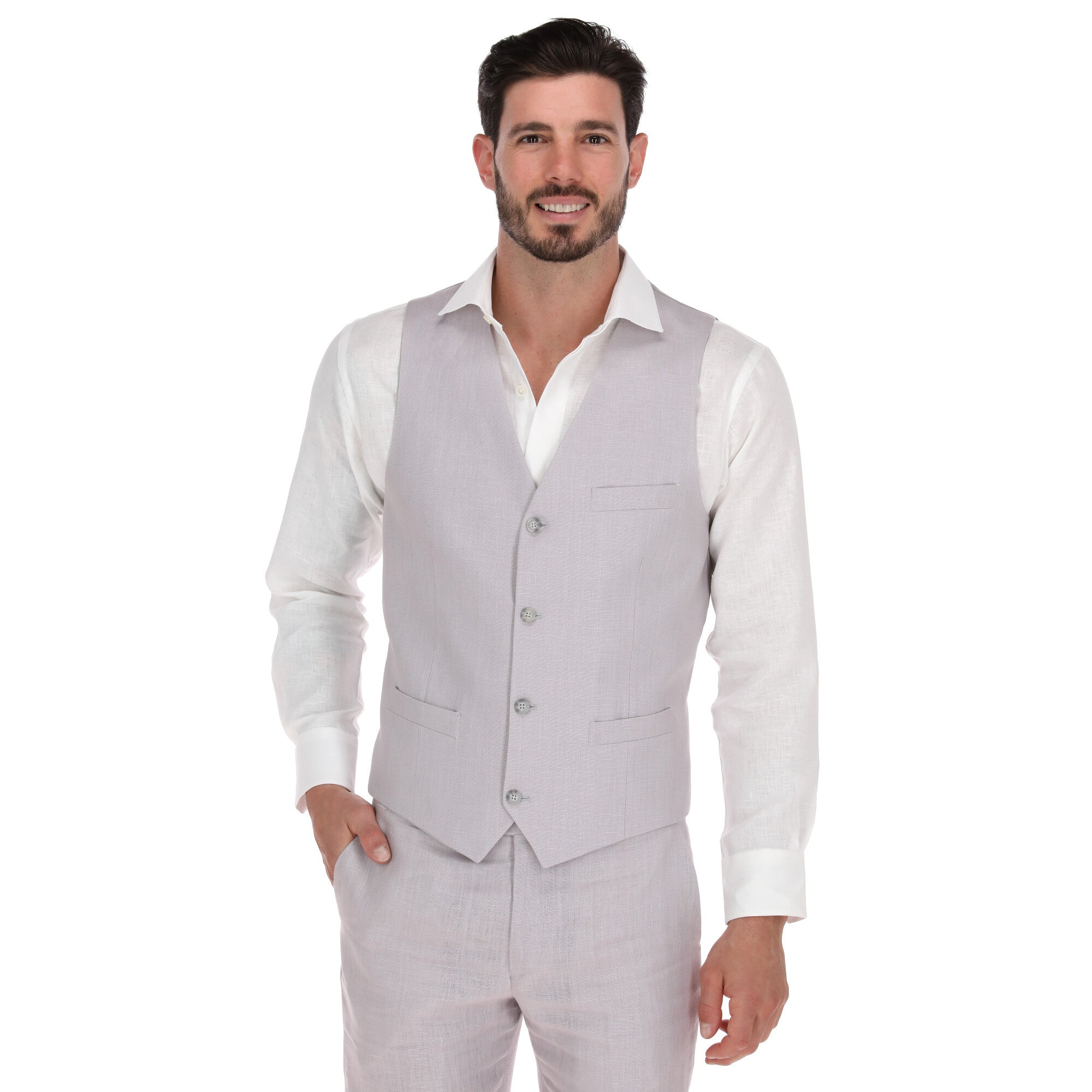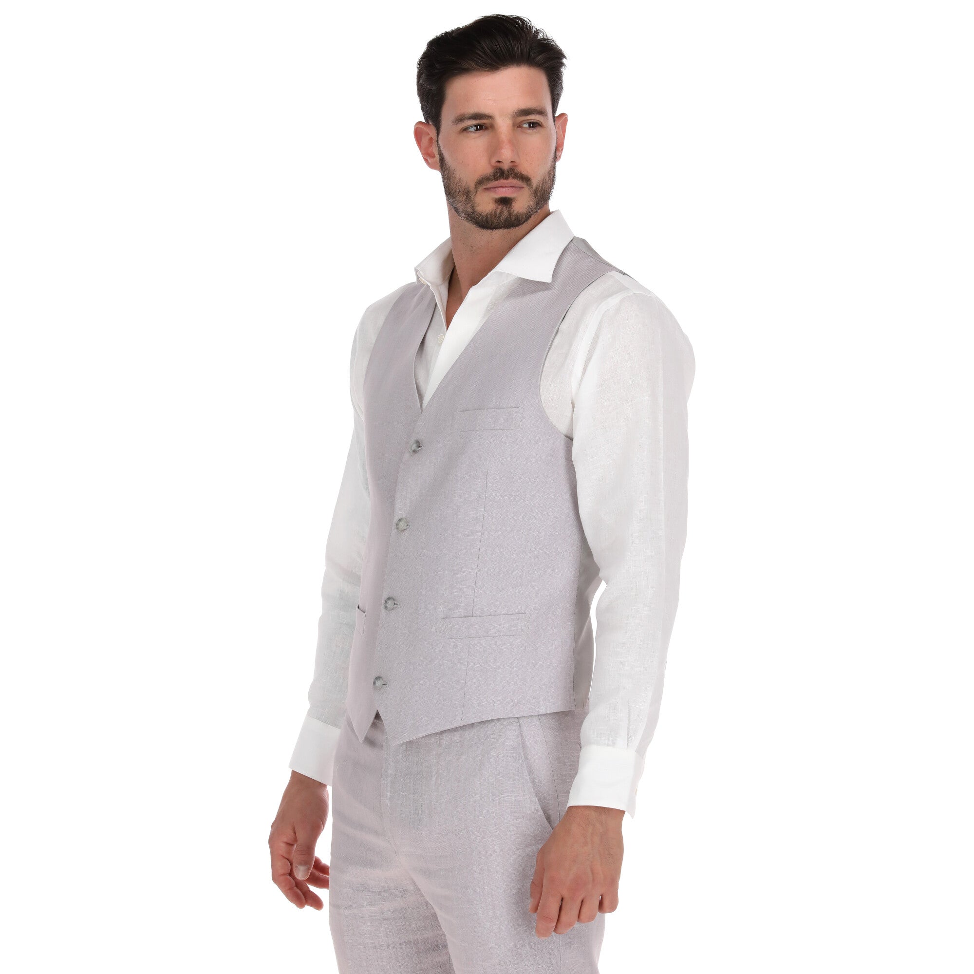 Descubre la pieza definitiva para la elegancia de clima cálido: nuestro Chaleco de Lino en Gris Claro. Su tonalidad suave, casi perla, y el tejido natural de lino crean un look fresco, sofisticado y perfectamente transpirable para cualquier evento de día. Es ideal para ceremonias en la playa, jardín o looks de novio relajados.