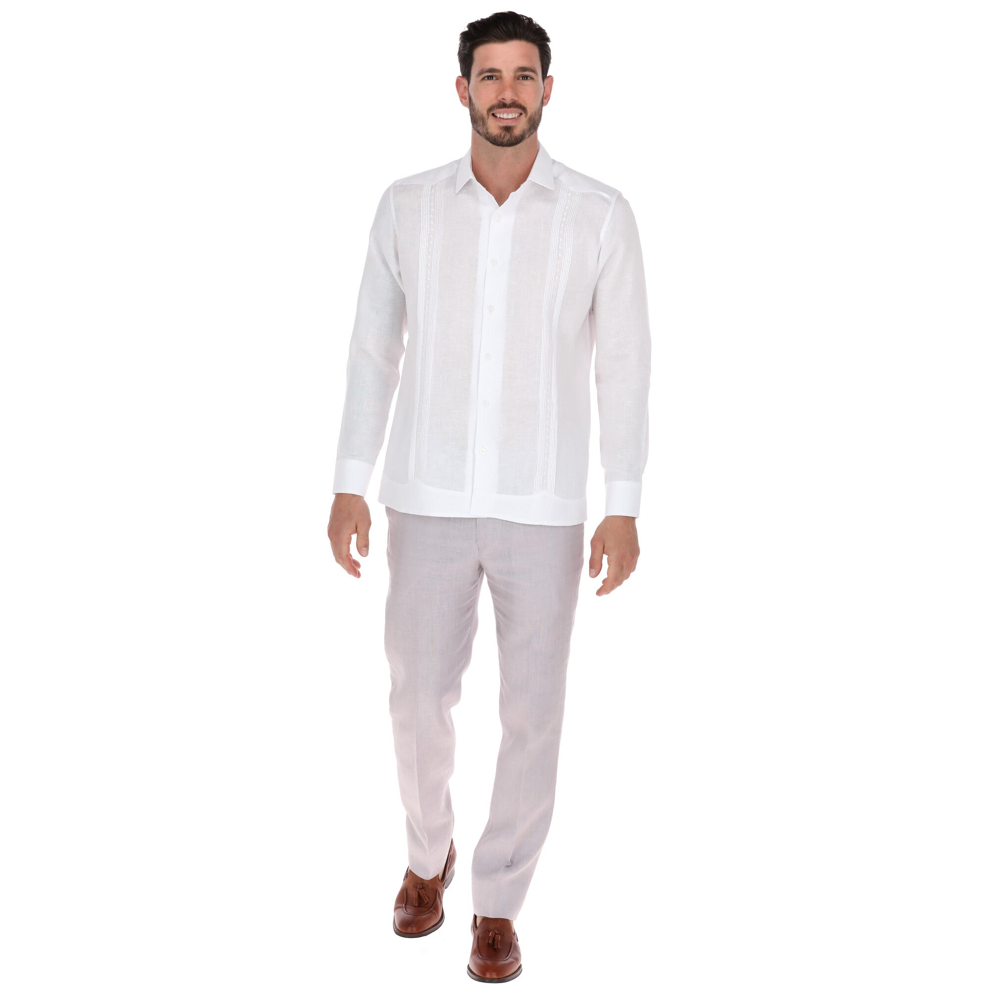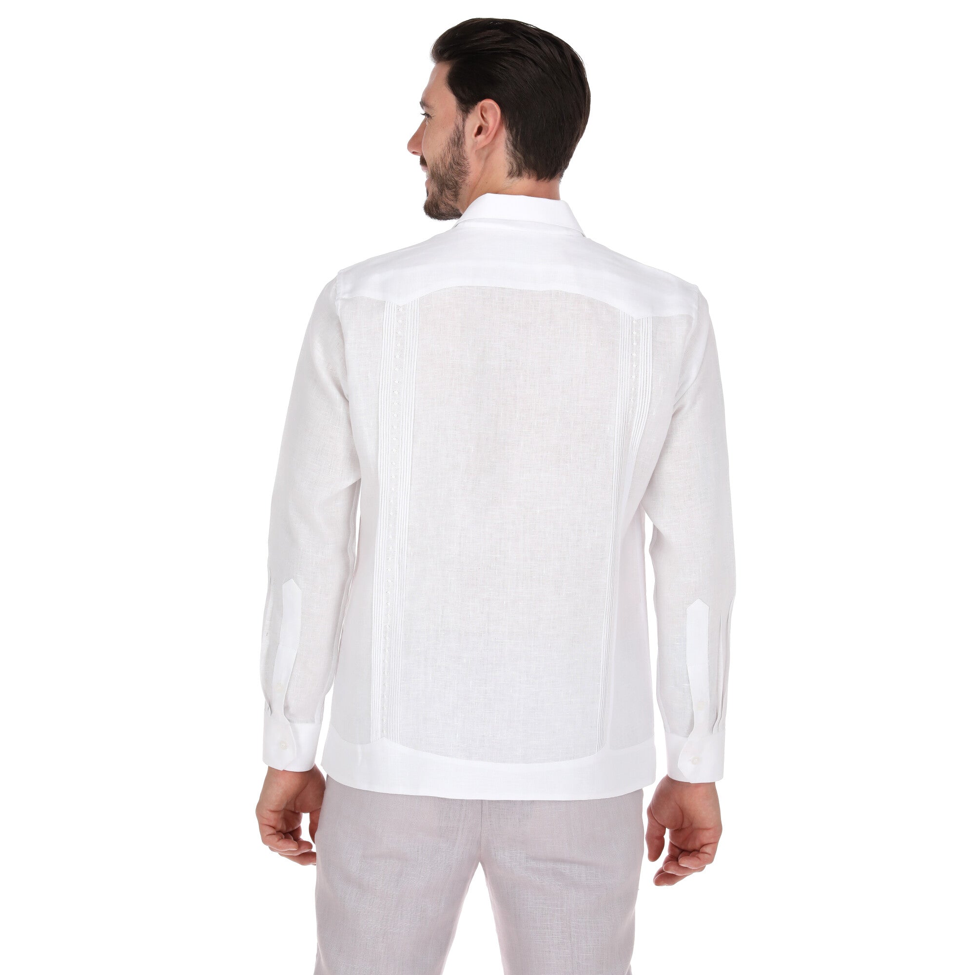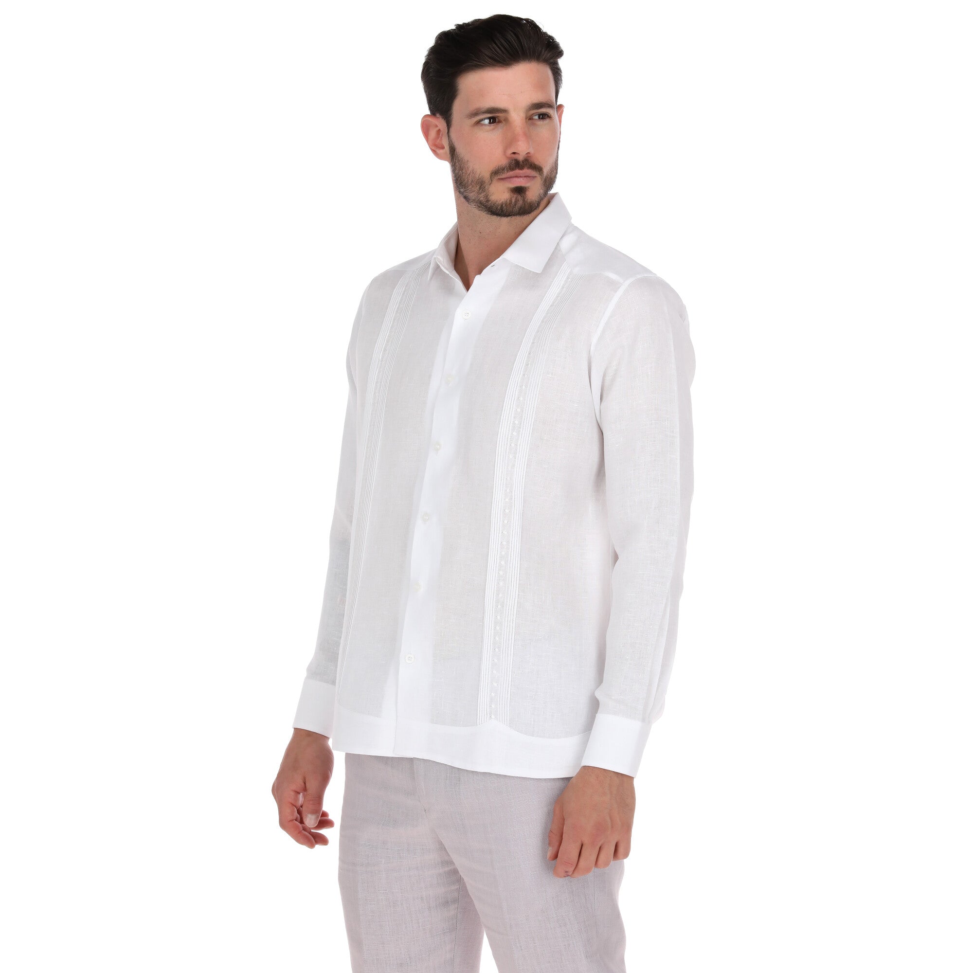 El diseño de la Guayabera Silky combina detalles tradicionales con un toque contemporáneo, como alforzas finamente trabajadas y sutiles bordados que aportan distinción. Su estilo de manga larga y corte impecable la hacen perfecta para bodas, eventos formales o momentos especiales que exigen una prenda única.