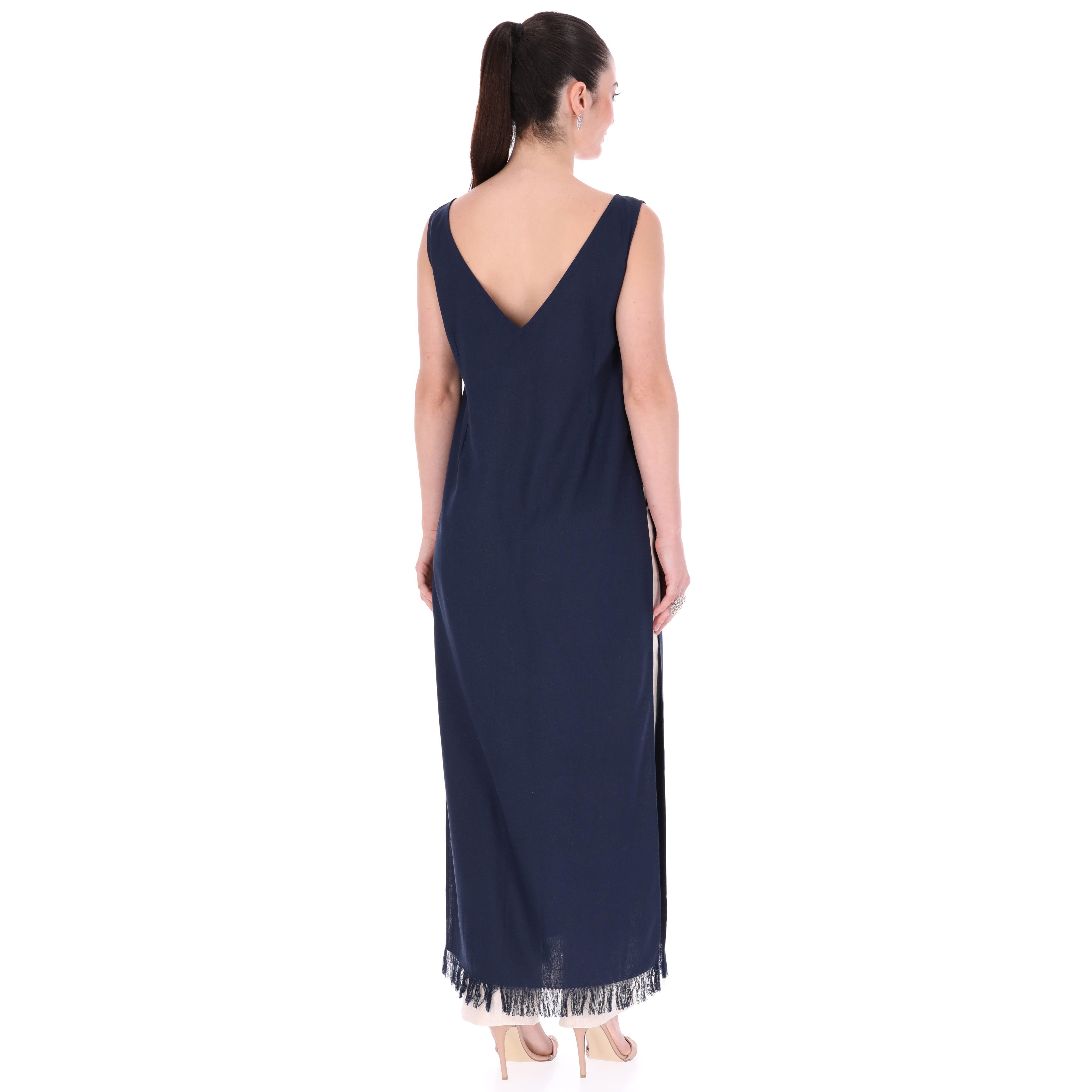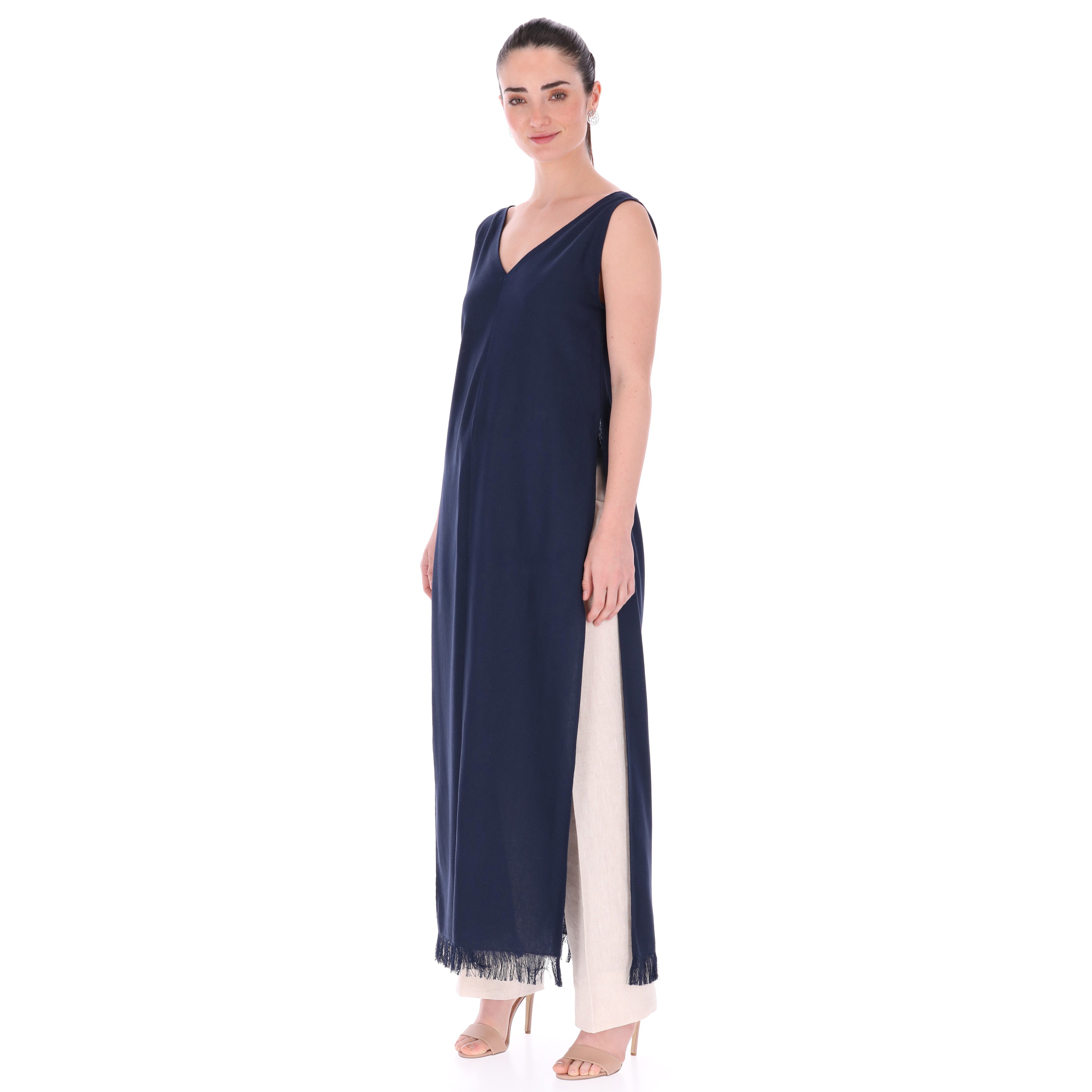 Diseño: Su diseño elegante incluye aberturas en los costados que aportan movimiento y un toque moderno, mientras que el detalle de deshilado en la parte inferior añade un acabado artesanal que resalta su exclusividad.